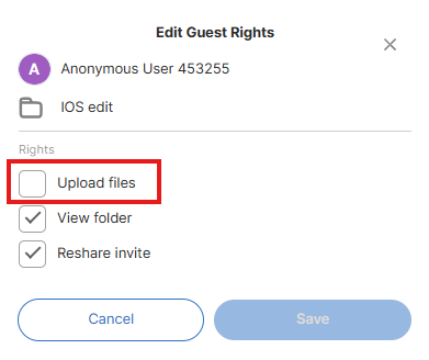 This feature allows a user to share an invite with another user and grant specific upload permissions. The invited user can upload files to the shared location based on the assigned access level.