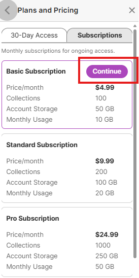 Users can purchase subscription plans such as 30-day and monthly plans, each offering different data usage limits.