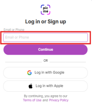 The Login / Sign Up page allows users to securely access the PicMe application or create a new account using an email address, phone number, or social login options. The same flow is used for both existing and new users.