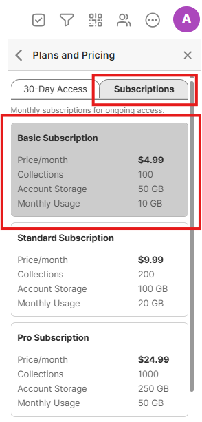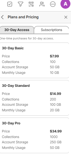 Users can purchase subscription plans such as 30-day and monthly plans, each offering different data usage limits.
