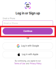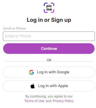 The Login / Sign Up page allows users to securely access the PicMe application or create a new account using an email address, phone number, or social login options. The same flow is used for both existing and new users.